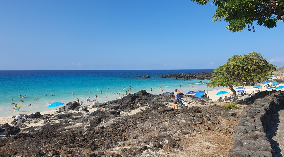그리고 우리는 서북쪽에 있는 Kua Bay로 향해서 물놀이를 두 시간 가량 즐겼다. 듣자하니 Kona쪽 해안가가 훨씬 얕고 파도가 마일드해서 수영하기 좋다고 해서 가봤는데 실제로 그랬다. 정말 멋진 해안가와 백사장이 우릴 반겨줬고, 즐겁게 물놀이 하다가 첫 날의 하이라이트인 만타가오리 스노클링장으로 향했다.