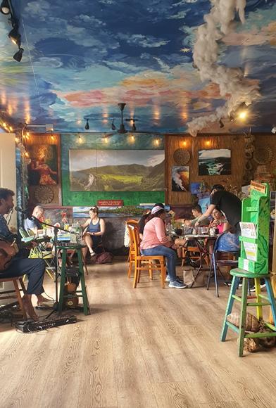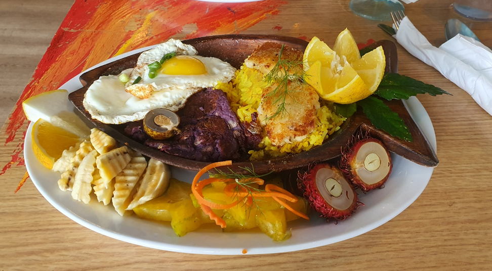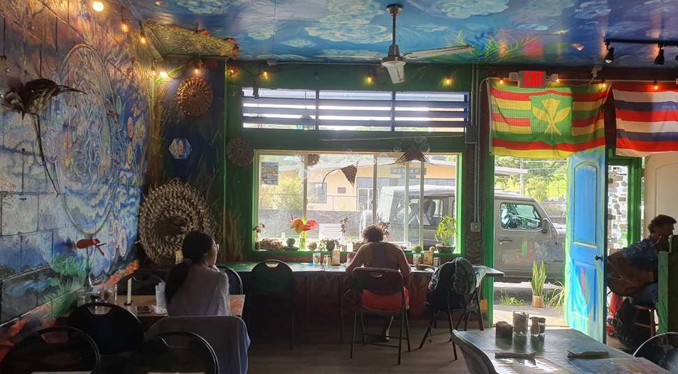 국립공원으로 출발하기 전, Pahoa라는 작은 마을에서 브런치를 먹고 출발했다. 우리가 선택한 식당은 Pele's kitchen 이라는 곳인데, 이런저런 브런치 메뉴를 팔고 있었는데, 와이프가 특히 좋아했다. 열대 과일이 마치 감자튀김 사이드로 나오듯이 같이 사이드로 나왔기 때문. 이런저런 열대과일도 맛보고 식당 분위기도 독특한데다가 작은 공연도 하고 있어서 있는 시간 자체는 즐거웠다.
